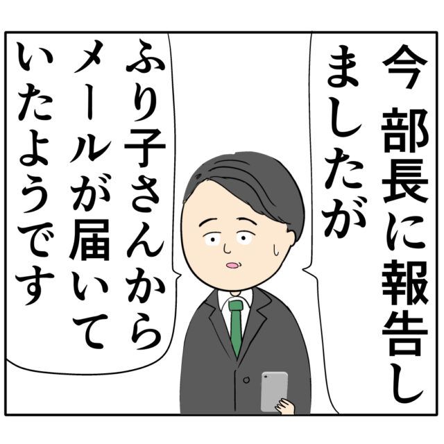 電話を終えた課長は「今部長に報告しましたが、ふり子さんからメールが届いていたようです」と良し男さんに話しました。