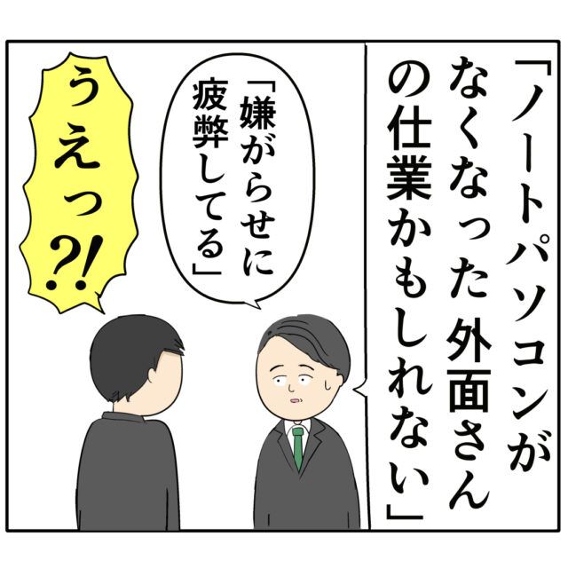 課長によると、ふり子さんから部長に「ノートパソコンがなくなった。外面さんの仕業かもしれない」「嫌がらせに疲弊してる」という内容のメールが届いていたとの事。それを聞いた良し男さんは「ぅえっ!?」と驚きます。