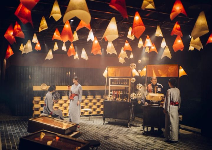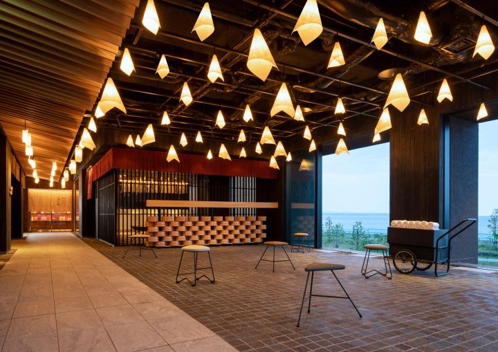 館内は和紙のちょうちんが照らす石畳の路地や、温泉街にある土産店、夜店をイメージした空間などが広がっており、賑やかな温泉街を彷彿させる旅館。建築家・隈研吾氏が設計、デザインした「湯の広場」は、前面に別府湾、右手にヨットハーバーを望む開放感のある空間となっています。広場には、桶を積んだような手湯や、別府の魚商人の屋台からインスピレーションを得た屋台(足湯手湯のタオル置き場)など、わくわくする仕掛けも。