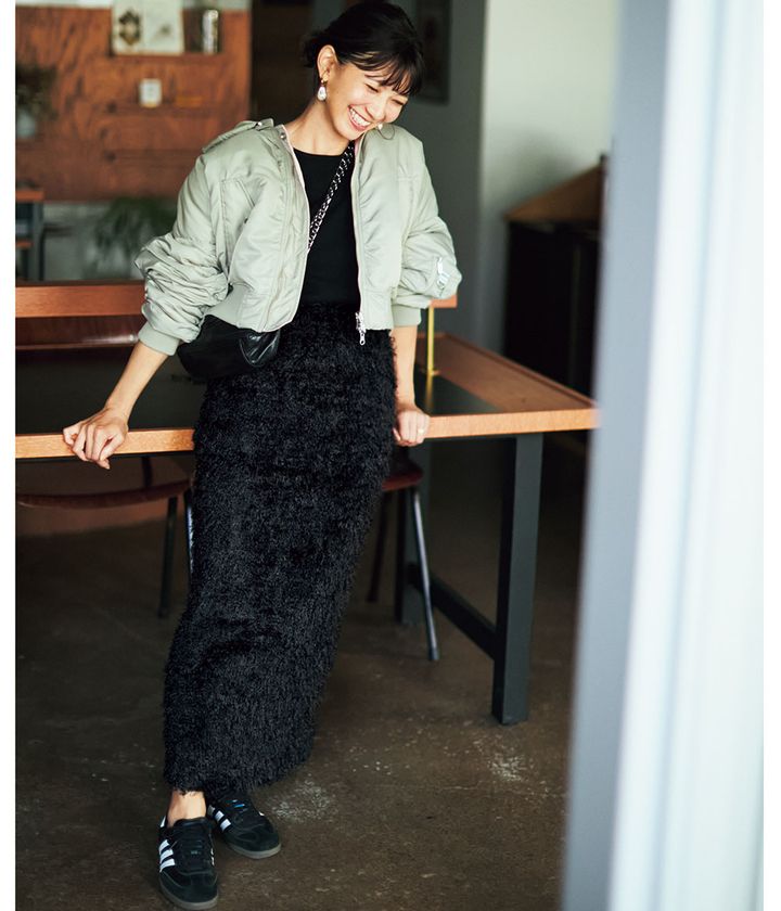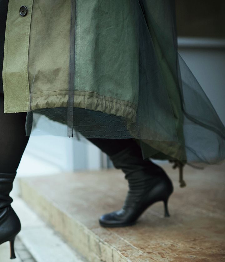 『男前なコートに甘いチュールを重ねているとこが今どき!しかもカジュアル感が抑えられてキレイめコーデにも最適。ミリタリー面を表にして裾からチュールをチラ見せしてもいい!』