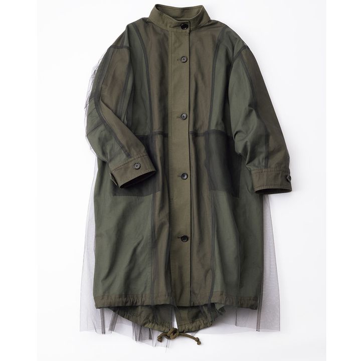 モッズコート×チュールのテイストMIX。リバーシブルなので、裏返すとミリタリー風にも着られる2WAY。