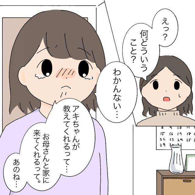 ママさんはびっくりし「えっ?どういうこと?」と聞くと「わからない・・・アキちゃんが教えてくれるって・・・お母さんと家に来てくれるって。あのね・・・」と涙目で話し始めました。