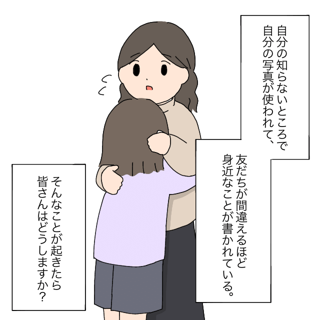 自分の知らないところで自分の写真が使われて、友だちが間違えるほどの身近なことが書かれていたら皆さんはどうしますか?