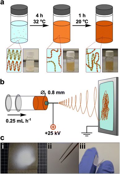 a:小麦粉と溶液の混合物、b:電気で引っ張り出す、c:麺が飛んでいくプレート、出来上がったシート/ 超極細スパゲッティの作り方/ Credit: Beatrice Britton et al., Nanoscale Advances(2024)
