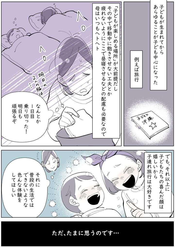 旅行を企画する側としては、メンバー全員を楽しませないといけない! みたいな気持ちが強くて。子連れ旅行は楽しいけど疲れるのも事実で。