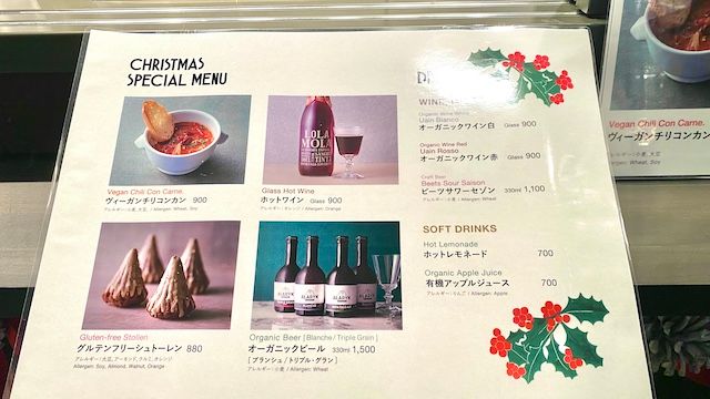 ヴィーガンチリコンカン900円/グルテンフリーシュトーレン880円/ホットワイン900円など