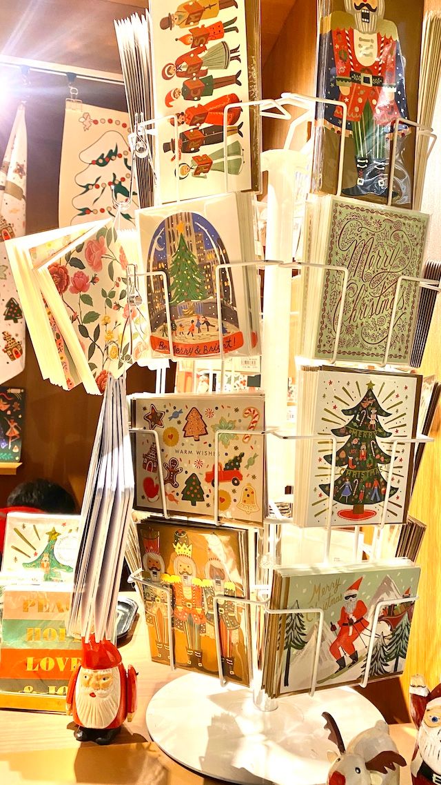 アメリカの人気イラストレーターによるペーパーアイテムや雑貨、表情が1つずつ異なるハンドメイドの木製人形シリーズなどが心温めてくれます。一番人気はクリスマスカードだそう(1つ700円前後)。