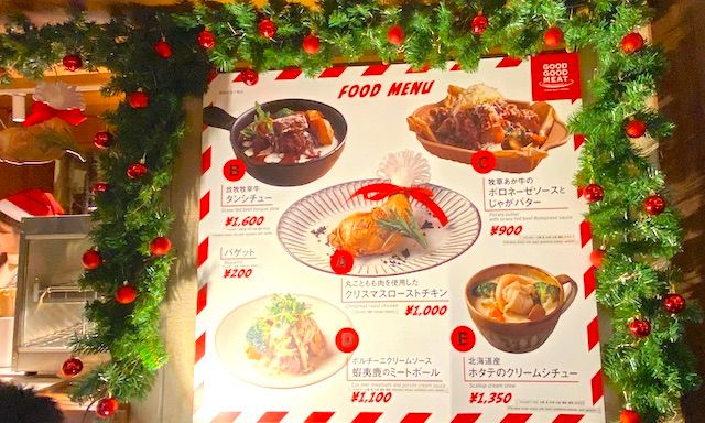 クリスマスローストチキン 1,000円/タンシチュー 1,600円/蝦夷鹿のミートボール 1,100円/北海道産ホタテのクリームシチュー 1,350円/牧草あか牛のボロネーゼソースとじゃがバター 900円/ハートランドビール(生)600円/ホットワイン700円など