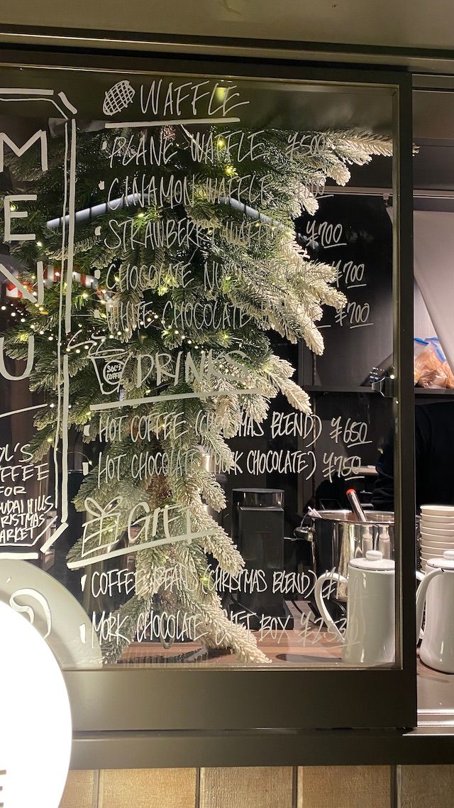 クリスマス限定ワッフル5種(プレーン・シナモン・ストロベリー・チョコレートナッツ・ホワイトチョコレート) 500円〜700円/ホットコーヒー 650円/ホットチョコレート 750円など