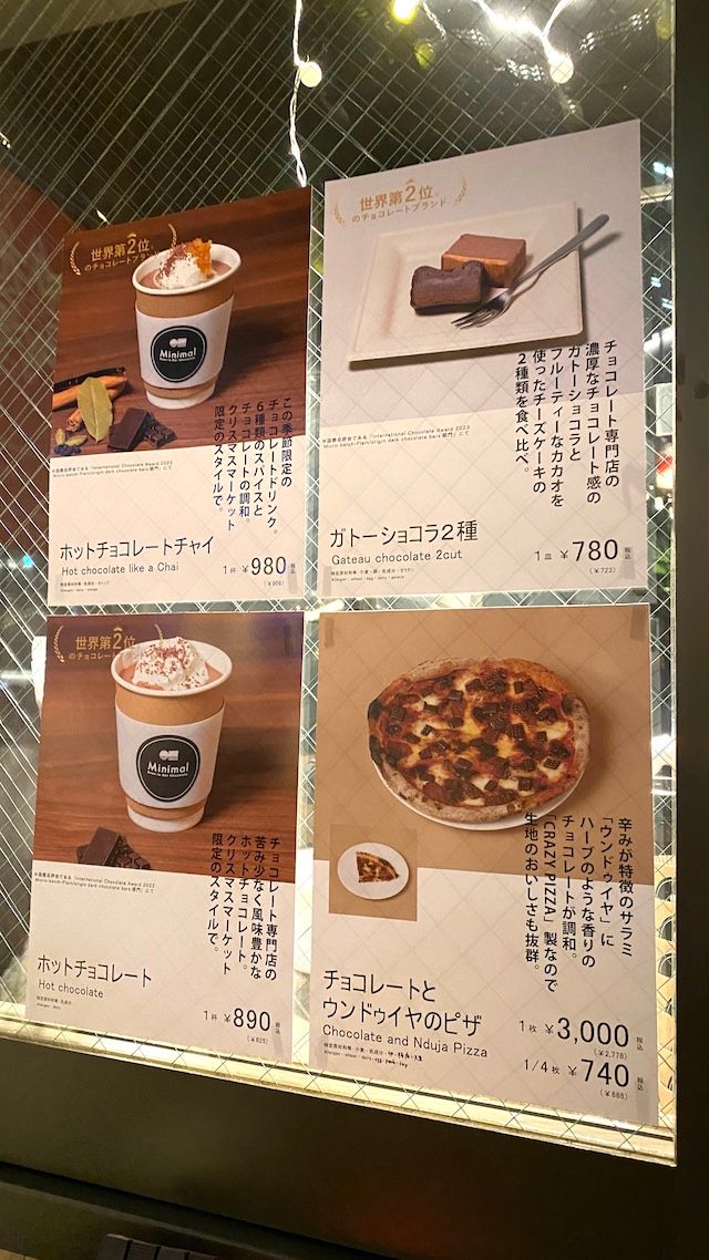 ホットチョコレート 890円/ホットチョコレートチャイ 980円/ガトーショコラ2種 780円/チョコレートとウンドゥイヤのピザ 1枚3,000円・1/4 740円など