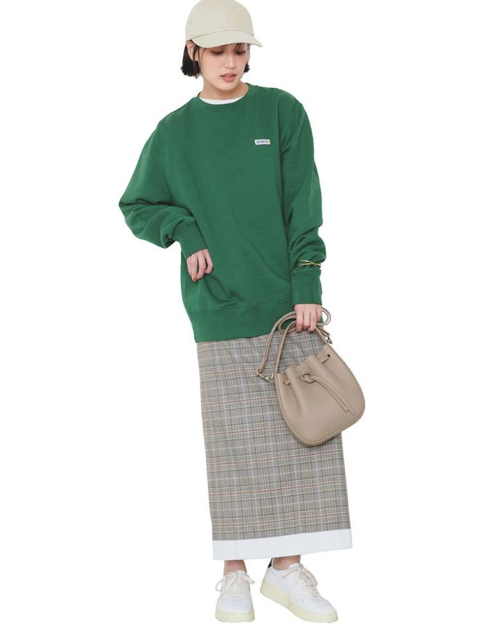だらしなく見えがちなスウェットをコーデに取り入れるなら、深グリーンでトラッド風に着こなすの気分。あえてウエストをアウトしてラフな装いに仕上げると、休日ムードにグッと垢抜けます。ボトムスはチェック柄のペンシルスカートを合わせて、縦ラインと知的さをアピール。白のスニーカーやキャップで洗練度を高めて。