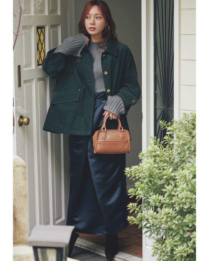 オーバーサイズのジャケットは無骨な印象のぶん、メンズっぽくならないように注意が必要です。中は体のラインが協調されるリブニットや光沢感のあるサテンスカートを合わせて、女性らしいシルエットに。全身をダークトーンでまとめることで、ジャケットの悪目立ちを防ぎ大人可愛い表情に仕上がります。