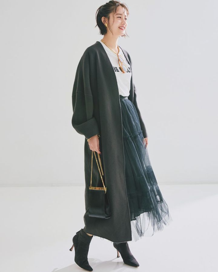 冬のワードローブに必須の「黒コート」は、毎年着るからこそアップデートして今年らしさをアピール。今季はボトルラインシルエットを選んで、女性らしいフォルムを意識するとうまくいきます。ボリューミィなチュールスカートを合わせても、着脹れせずスタイリッシュな装いに。袖がゆったりなカジュアル要素のあるディテールなので、ロゴTとも好相性です。
