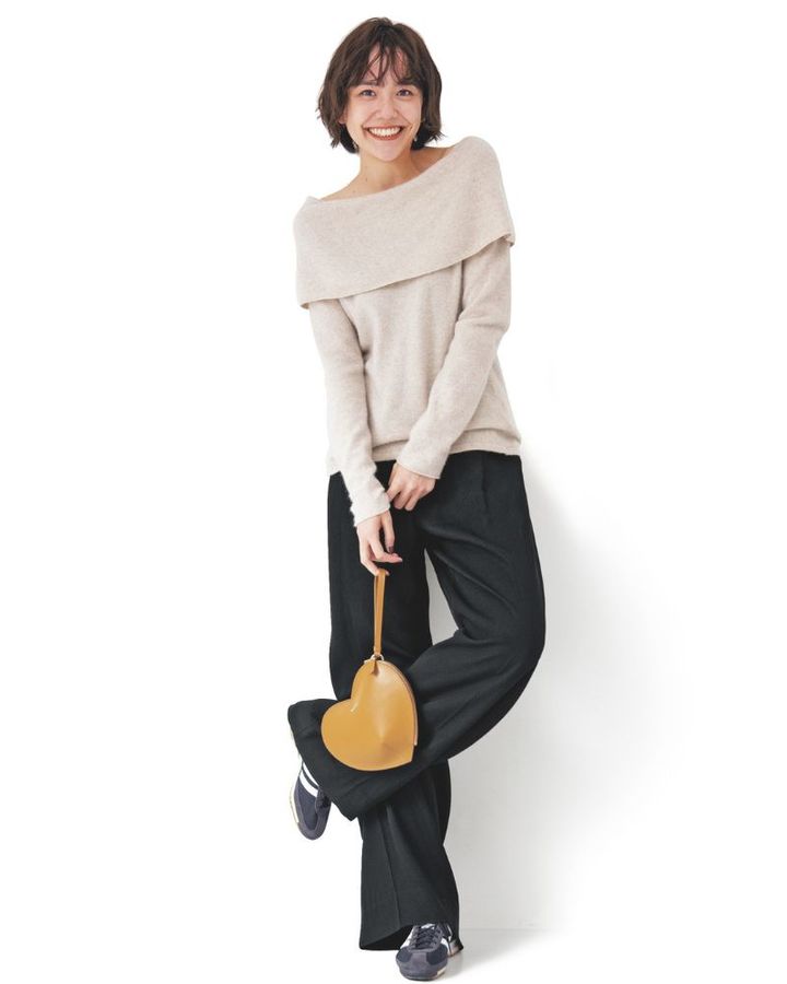 流行中の「オフショルニット」を大人が着るなら、肌見せがメインにならないようヘルシーさを取り入れるのが鉄則。色味はベージュを選んで、優し気な印象に。ボトムスはいつもの黒パンツで甘辛MIXに仕上げると気負わず好バランスです。小物はレザーアイテムでキリッと引き締め、粋な肌見せを叶えて。