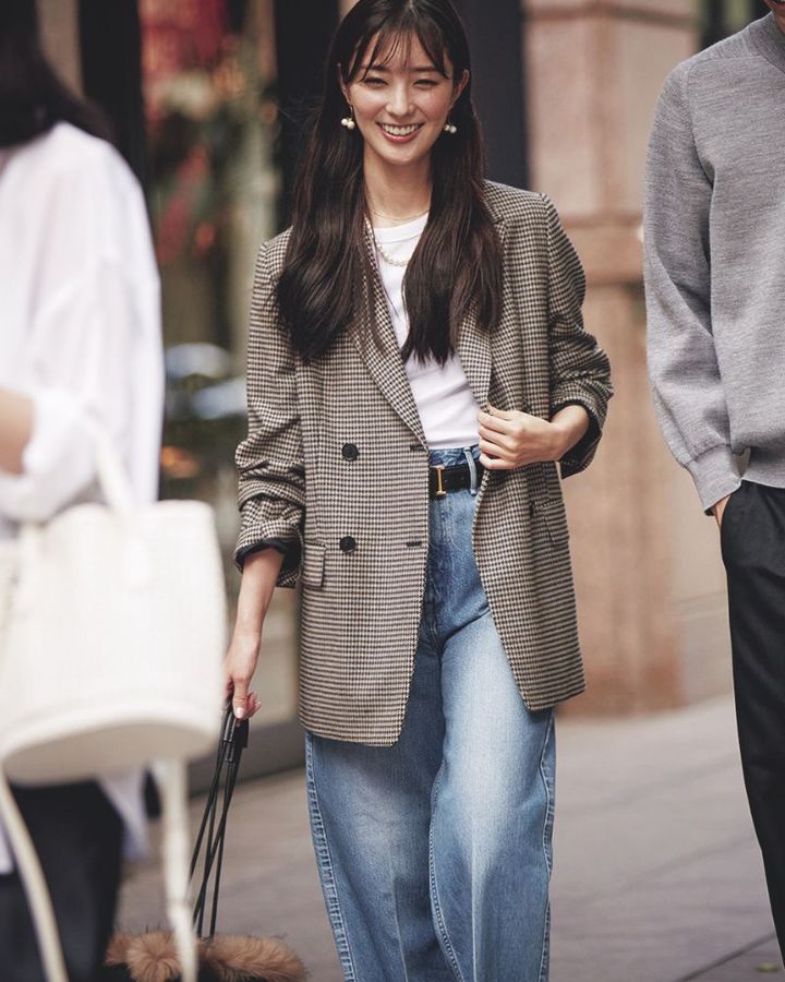 ベーシック派が重宝する「デニムパンツ×白T」は休日の万人ウケコーデですが、細部に引き締めテクニックを忍ばせるのが大人のルール。控えめな格子柄ジャケットで上品さをプラスして、キリッと引き締めるとうまくいきます。ゴールドジュエリーを散りばめるのも忘れずに。季節感漂うファー付きのバッグを投入して変化をつけるのが正解です。