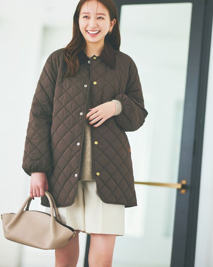 ともすればほっこり見える「キルティングジャケット」は、着こなしに工夫してあか抜けを。アウターがボリューミィなぶん、重くならないよう白のハーフパンツでヘルシーに肌見せしてバランス調整することで、軽快な印象に刷新します。全体をブラウン基調のワントーンでまとめて感度の良さをアピールして。