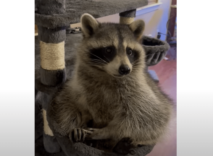 3. キャットタワーでくつろぎタイム♪ 猫のようなアライグマさん。