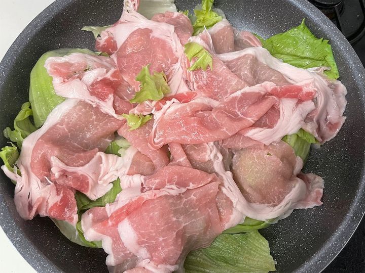 1. フライパンにレタスをすべて入れ、その上に豚肉を広げながら並べてのせます。