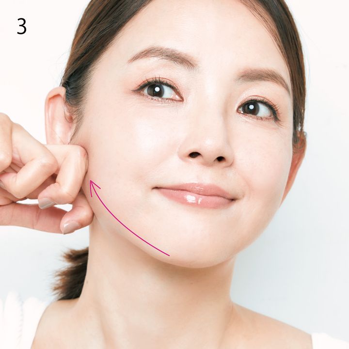 3.顎先からフェイスラインの骨に沿って、耳下まで指を滑らせます。老廃物排出の重要なパーツです。左右交互に3セット行います。