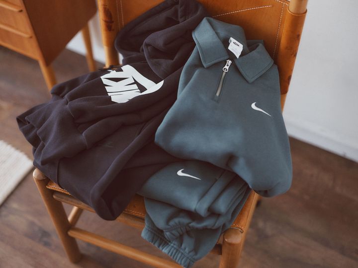 【モデル】スウェットトップス¥8,800スウェットパンツ¥9,350スニーカー¥12,430/すべてナイキ スポーツウェア(NIKE カスタマーサービス 0120-6453-77)コート¥176,000Tシャツ¥14,300/ともにエイトン(エイトン青山 03-6427-6335)ソックス¥1,980/トゥー ユナイテッドアローズ(ユナイテッドアローズ 渋谷スクランブルスクエア店 03-5774-1030)サングラス¥50,600/モスコット(モスコット トウキョウ 03-6434-1070)ネックレス¥ 201,300ピアス¥74,800/ともにウノアエレ(ウノアエレ ジャパン 0120-009-488)ブツ【静物】オリーブ スウェットトップス¥8,800スウェットパンツ¥9,350黒パーカ¥10,560スウェットパンツ¥14,850/すべてナイキ スポーツウェア(NIKE カスタマーサービス 0120-6453-77)