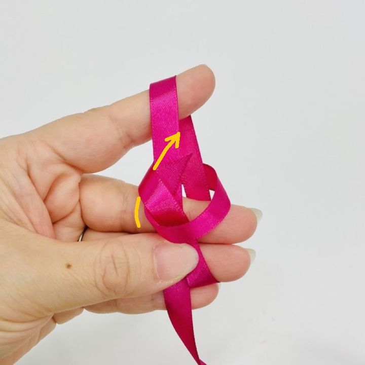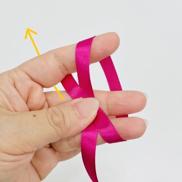 人差し指と中指の間を広げたら、人差し指の下からリボンを通してください。
