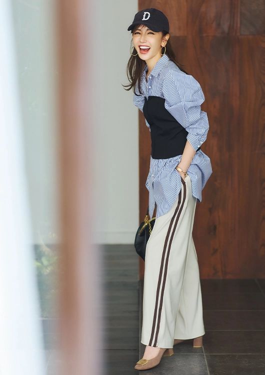 トラックパンツをビスチェ&シャツで都会的にアレンジ