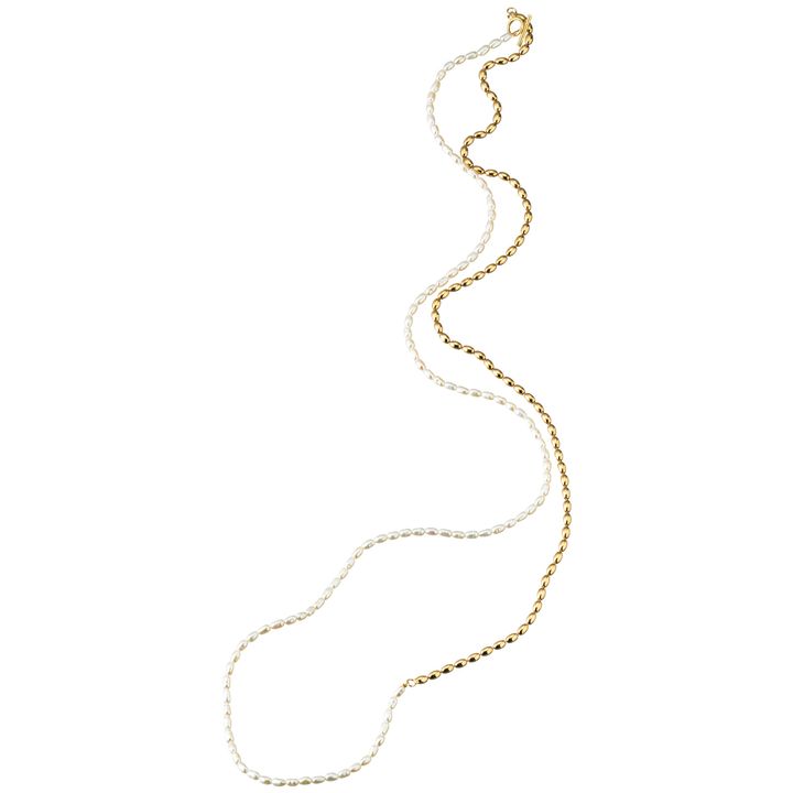 ベビーパールのロングネックレスで、センシュアルなムードも気品のある肌艶も。ネックレス¥20,900(リズリーク/ロードス)