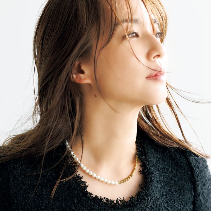 ファッション性の高いゴールドチェーンとパールがコンビになったネックレスは、クールな印象。肌のトーンアップを狙えるだけでなく、着こなしの洗練度がさらりと高まります。ネックレス¥12,100(Pearl for Life/ロードス)ツイードトップス¥41,800(ORR/サードマガジン)