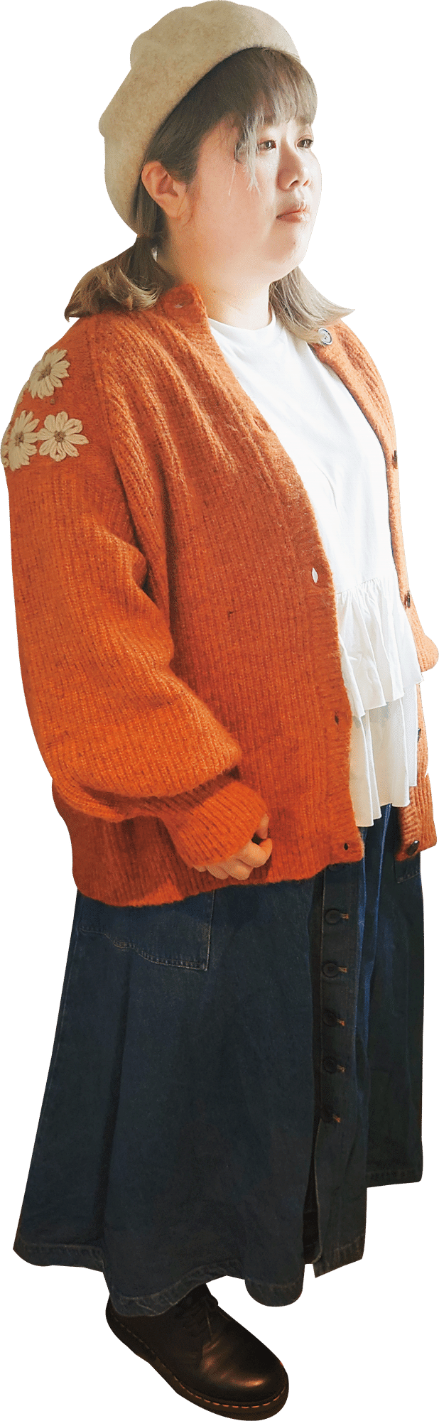 秋らしいカラーのカーディガンとデニムスカートの組み合わせがお気に入りのコーディネートです。カーディガンの肩のフラワーモチーフがポイント。二段フリルの白いトップスを合わせて明るさをプラスしています。