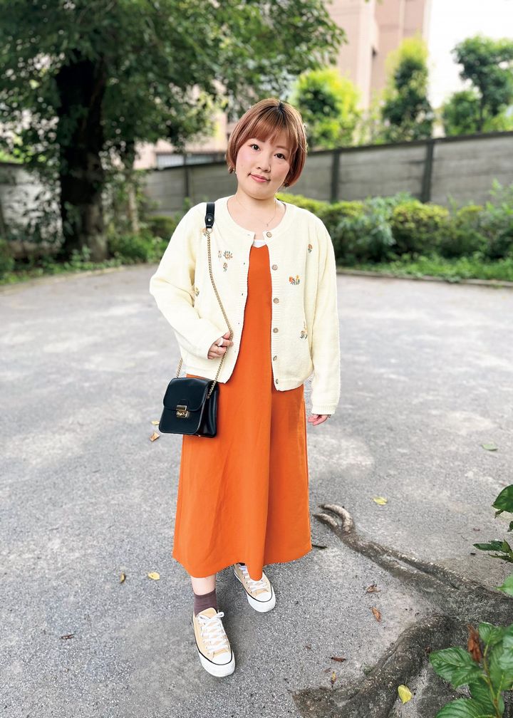 着心地がよいニットは、小花柄のオンレジがポイント。その色に合わせてオレンジのワンピースをセレクトし、まとまり感を出すように工夫しました。チェーン付きのブラックショルダーバッグで上品な雰囲気に◎