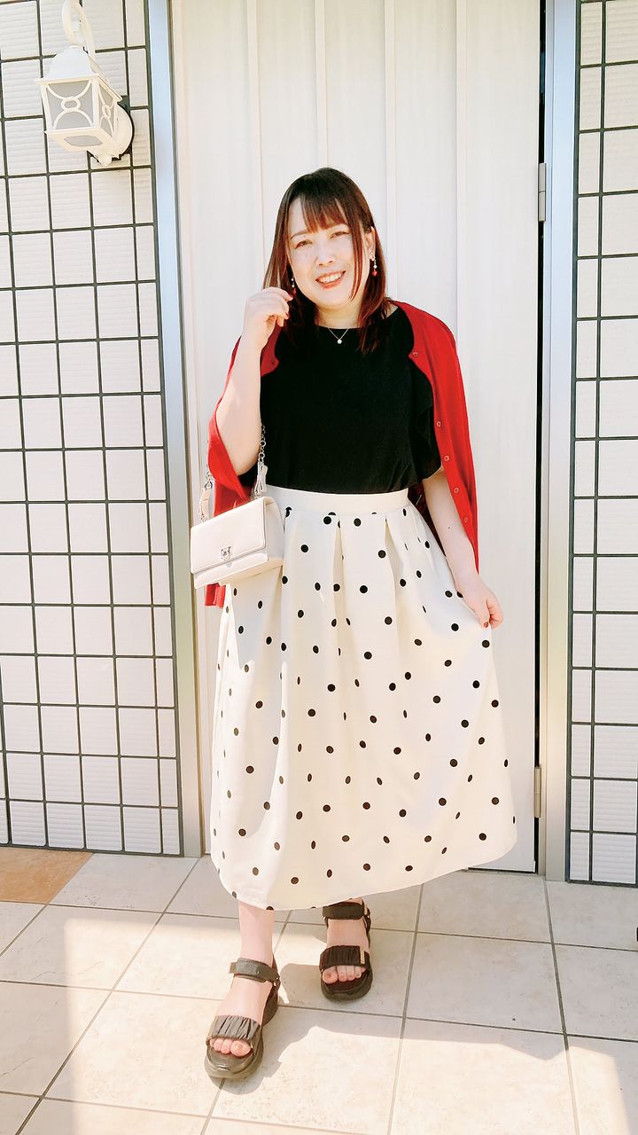フロッキープリントのドット柄スカートにブラックのトップスを合わせたシンプルコーデに、カーディガンの赤を効かせました。ネイルも深い赤をセレクト。スカートは、ウエスト後ろゴムなので食欲の秋にも対応しています。