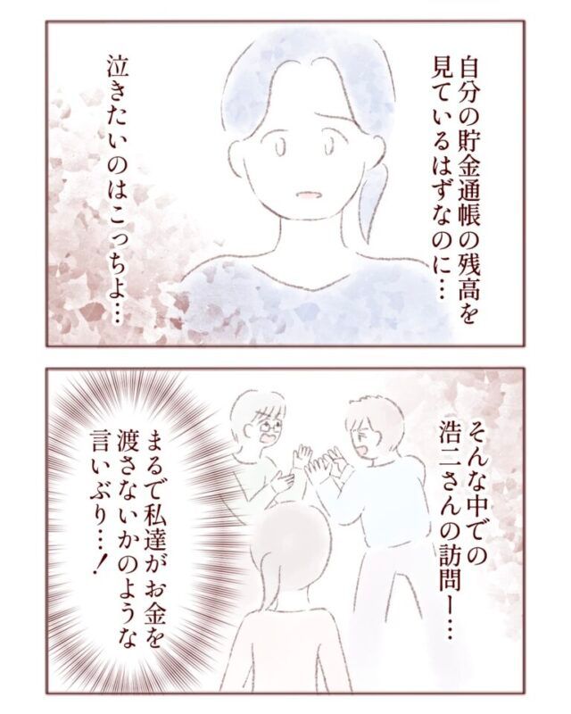 夫と義母のやり取りを見ていた私は、正直(自分の預金通帳の残高を見ているはずなのに・・・泣きたいのはこっちよ)と思いました。それなのに怒鳴り込んできた浩二さんの口ぶりは、まるで私たちが渡さないかのよう。すごくモヤモヤしました。