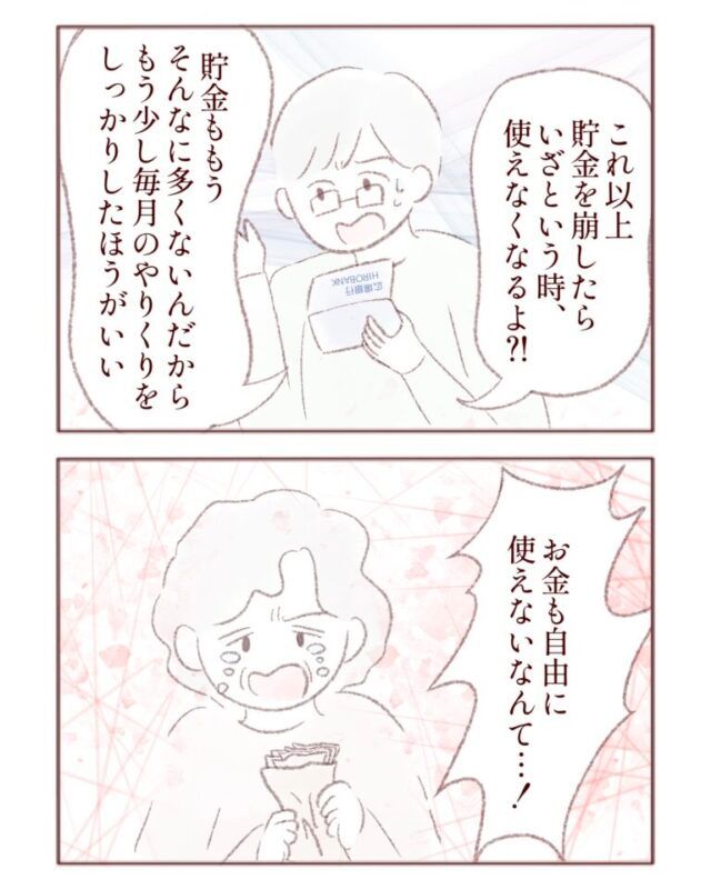 あまりにも義母が散財するので、とうとう夫が「これ以上貯金を崩したら、いざという時に使えなくなるよ!?貯金ももうそんなに多くないんだから、もう少し毎月のやりくりを考えたほうがいい」と義母に言ったことがありました。すると義母は、「お金も自由に使えないなんて・・・!」と泣き出してしまったのです。