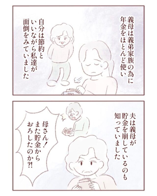 義母は浩二さんのためにほとんどの年金を使ってしまうので、自分の事にかかるお金は「節約」と言いながら、私たち夫婦が払っていました。そして夫は義母が自分の貯金を崩してまで浩二さんのために使っていることも知っていました。
