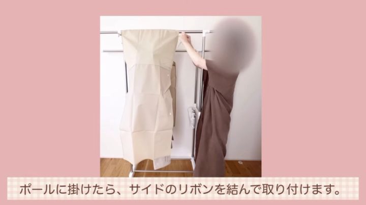 クローゼットのポールに固定し、吊り下げて使用します。サイドはツルツルした素材でホコリがつきにくく、もしホコリがついたとしてもサッとはらえます。