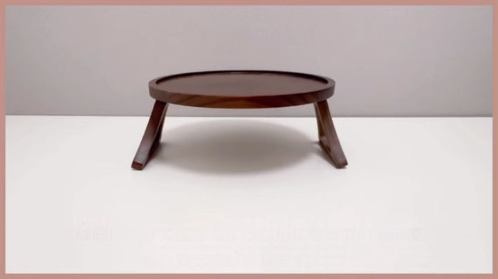 天板は円形の深みのあるブラウンカラーのトレイで、裏側についている脚を広げるだけで簡単に組み立てられます。脚は底に向かって広がる形で、安定感も抜群!