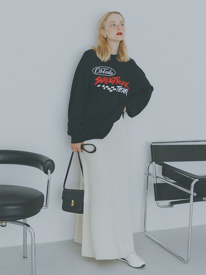 軽やかなイメージから一変、ニットによる重みで迫力が増した白のスカート。すそだけに広がりが出る落ち感とドレープでスタイルアップにも効果を発揮。