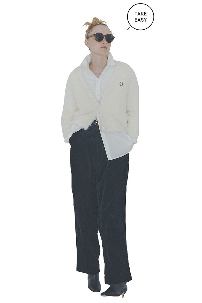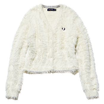 白カーディガン 26,400円/フレッドペリー × レイ ビームス(レイ ビームス 新宿) バランスがとりやすい、シャープなVネックとやや短めの着丈。