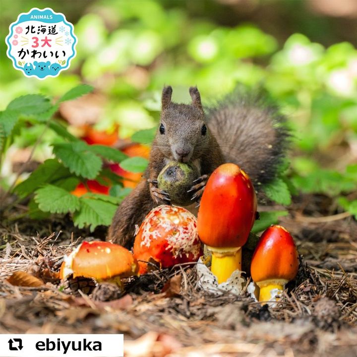 食べても美味しいだけでなく、赤い色がとても美しいキノコですので、エゾリスが並ぶと、まるで〝スーパーマリオ〟か〝ポケモン〟的な感じになりますね。