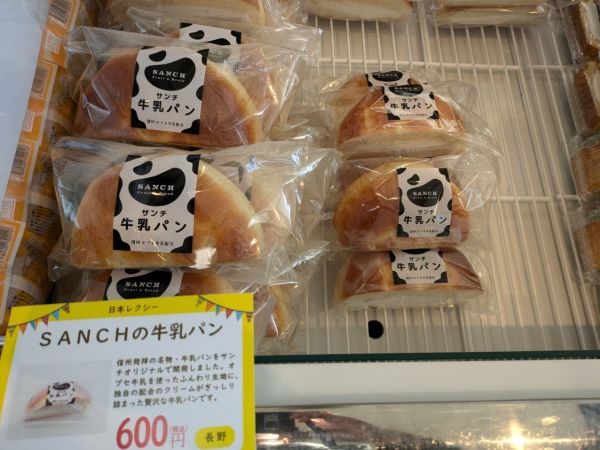 スタッフの方がお勧めというのは、「SANCHの牛乳パン(ハーフ)」(日本レクシー/長野県)。信州発祥の名物・牛乳パンをサンチオリジナルで開発しました。オブセ牛乳を使ったふんわり生地に、独自の配合のクリームがぎっしり詰まった贅沢な牛乳パンだそうです。
