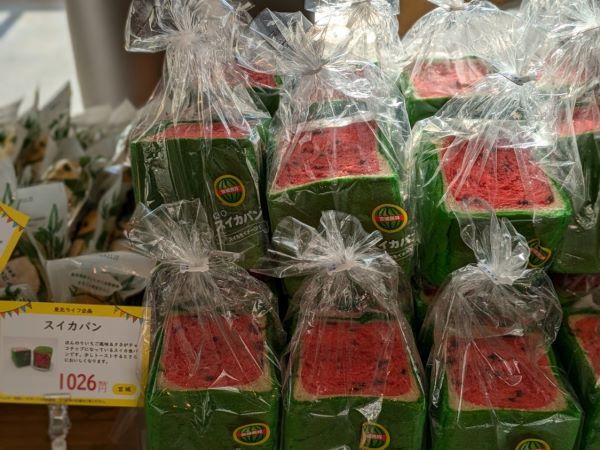 ギフトにもお勧めというのは、宮城県出身なのに知らなかった(汗)「スイカパン」(塚本商店/宮城県)。ほんのりいちご風味&タネがチョコチップになっているスイカ食パンです。少しトーストするとさらにおいしくなるそうですよ。
