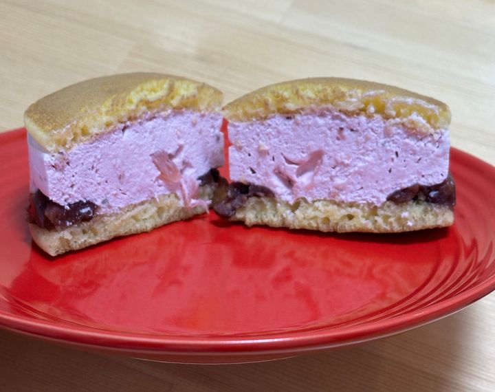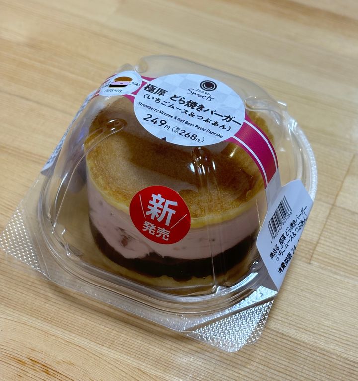 まずは、ファミリーマートのファミマルスイーツ、「極厚どら焼きバーガー (いちごムース&つぶあん)」です。