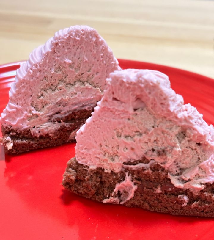 ピンク色のホイップが、ココアスポンジの上にもりもり飾られています🥹