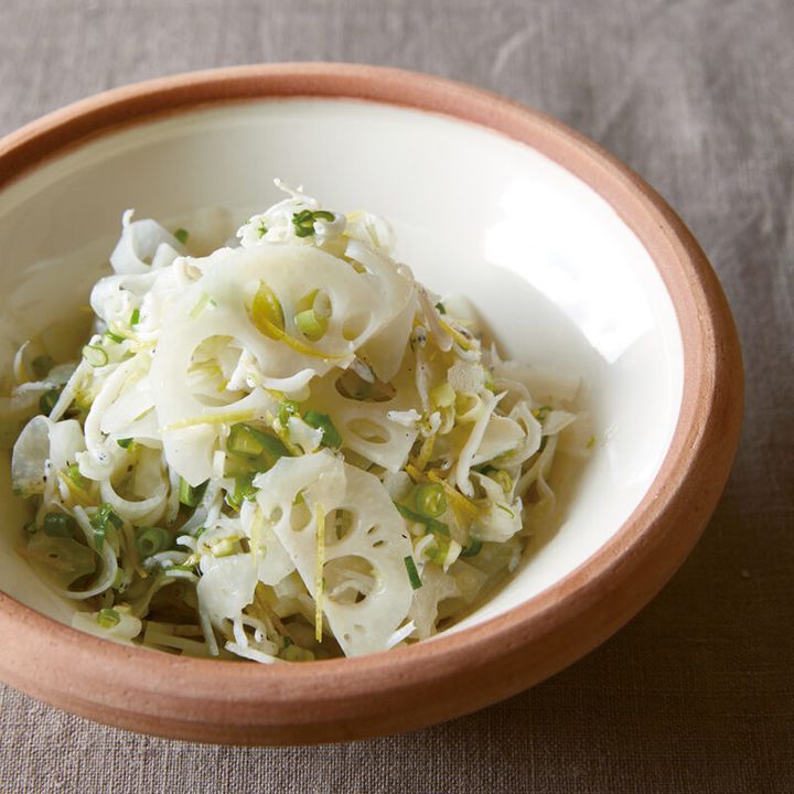 れんこんは皮をむいて薄い半月切りにし、水にさっとくぐらす。レモンは表皮を包丁で薄く削り、せん切りにする。果汁は絞ってボウルに入れる。小ねぎは小口切りにする。