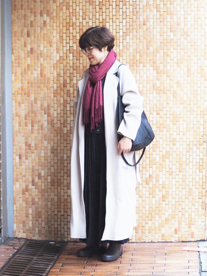 「洋服をベーシックカラーでまとめたので、ストールはあえてボルドーを選びました」。こっくりとした深いカラーが冬の装いにフィット。