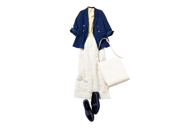 ダブルブレストジャケット¥18,920/LILY BROWN(LILY BROWNルミネエスト新宿店) 刺繍タイトスカート¥20,900/マイストラーダ イエローセットアップ(トップス)¥17,600/ミラ オーウェン ルミネ新宿2店 トートバッグ¥13,000/PLST ローファー¥33,000/銀座かねまつ(銀座かねまつ6丁目本店)