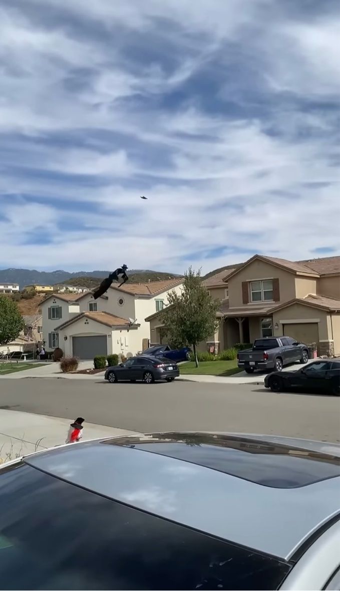 平穏な住宅街でカメラが捉えたのは、空を飛んでいる人らしきシルエット。 なんと、それは黒いローブをまとった魔女だったのです!!