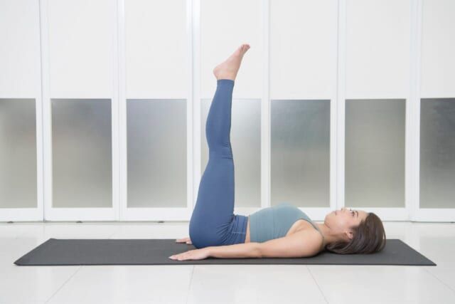 (3)キープが終わったら息を吸い、息を吐きながら脚を元の位置に戻していく