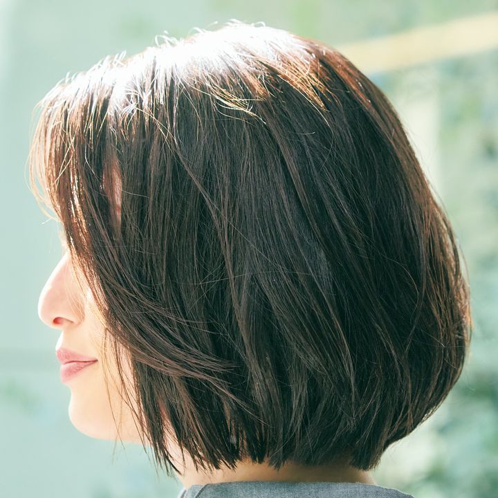 衿足下2~3cmの前下がりのボブに、顔周りは鼻下くらいからレイヤーを。内巻きにブローしたらバームを軽くもみ込んで今時なパサッとした質感に。前髪は8:2くらいの深めから分けてトップに高さを出して若々しく見せるのがコツ。
