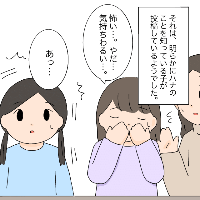 ある日、娘ハナちゃんが「私の振りをしている人がいるみたいなの」とママさんに相談をしました。その日の夜、アカウントを見つけて知らせてくれた友達アキちゃんとアキちゃんママが家に来て見せてくれたアカウントには、ハナちゃんの写真が使われていました。